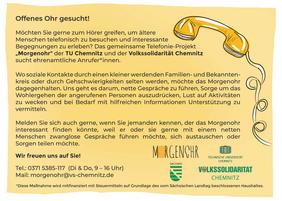 „Bis jetzt konnten wir schon über 40 Patenschaften an Menschen, die den Wunsch nach mehr sozialem Kontakt haben, vermitteln. Über 25 geeignete Ehrenamtliche stehen dem Projekt und somit unseren Mitmenschen zur Verfügung. Manche haben durch eine engere Zusammenarbeit oder organisatorische Besonderheiten bereits mehrere Anrufwünsche übermittelt bekommen. Dennoch verfügen wir über weitere Kapazitäten. Es gibt in unserem ‚Ehrenamts-Pool‘ noch einige Mitstreiter, welche bisher keinen persönlichen ‚Anruf-Auftrag‘ erhalten konnten“, berichtet Projekt-Koordinator Andreas Wolf-Kather, Leiter Mitgliederbetreuung bei der Volkssolidarität Chemnitz. „Auch diesen Interessierten ‚in Bereitschaft‘ möchten wir unseren Dank für die gezeigte Ausdauer aussprechen. Wir sind uns sicher, dass auch für jene Projekt-Freundinnen und Freunde noch geeignete Patenschaften entstehen werden.“